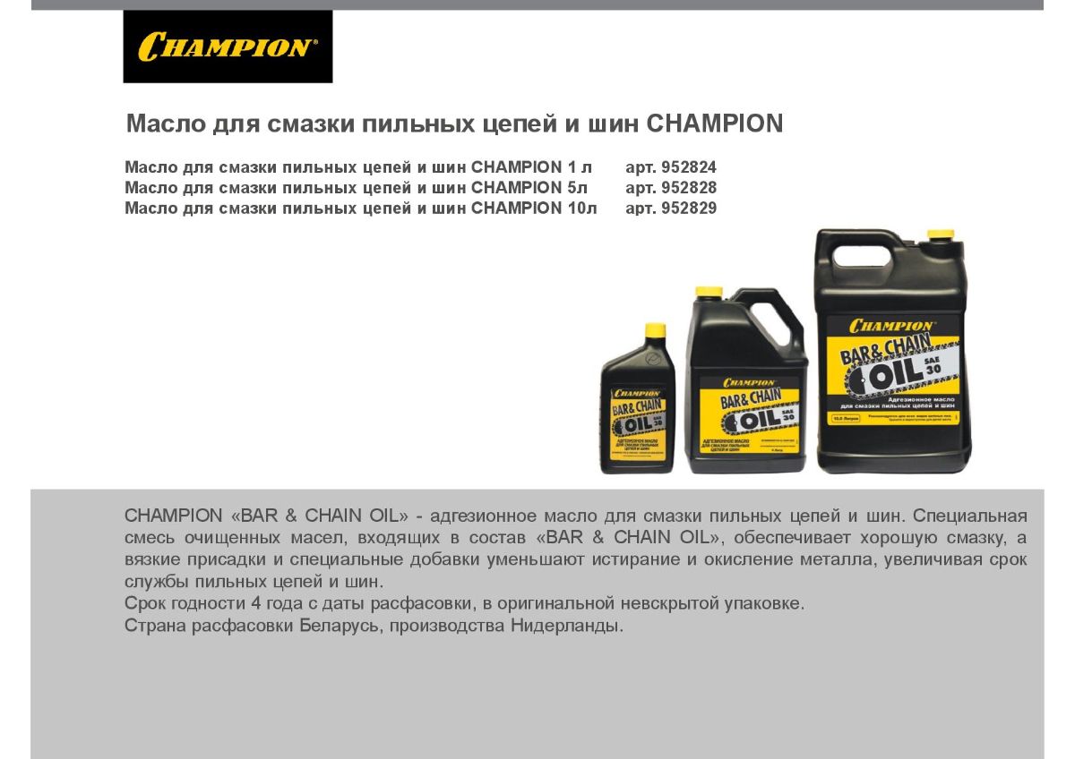— CHAMPION «BAR & CHAIN OIL» — это адгезионное масло, предназначено для смазки пильных цепей и шин. Специальная смесь очищенных масел, входящая в состав «BAR & CHAIN OIL», обеспечивает хорошую смазку, а вязкие присадки и специальные добавки уменьшают истирание и окисление металла, увеличивая тем самым срок службы пильных цепей и шин. Масло CHAMPION «BAR & CHAIN OIL» — это высококачественный экологичный продукт, имеет низкий уровень содержания серы и полностью разлагается в почве.