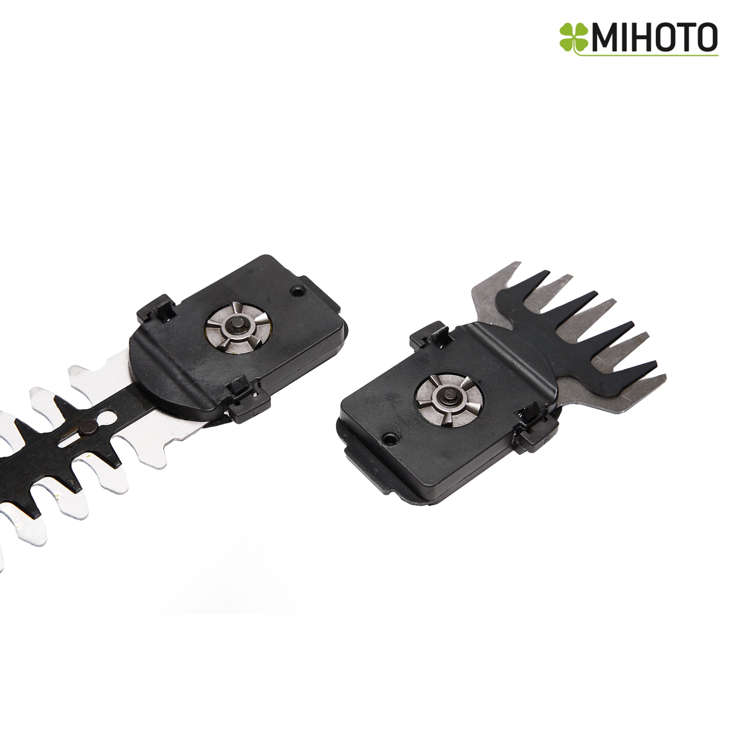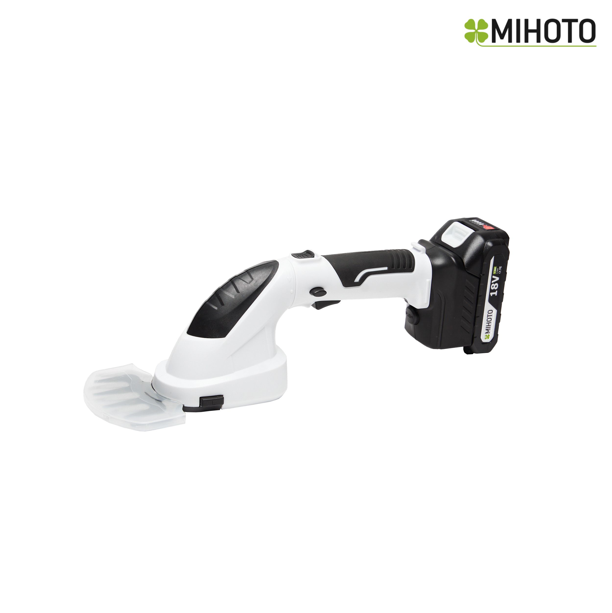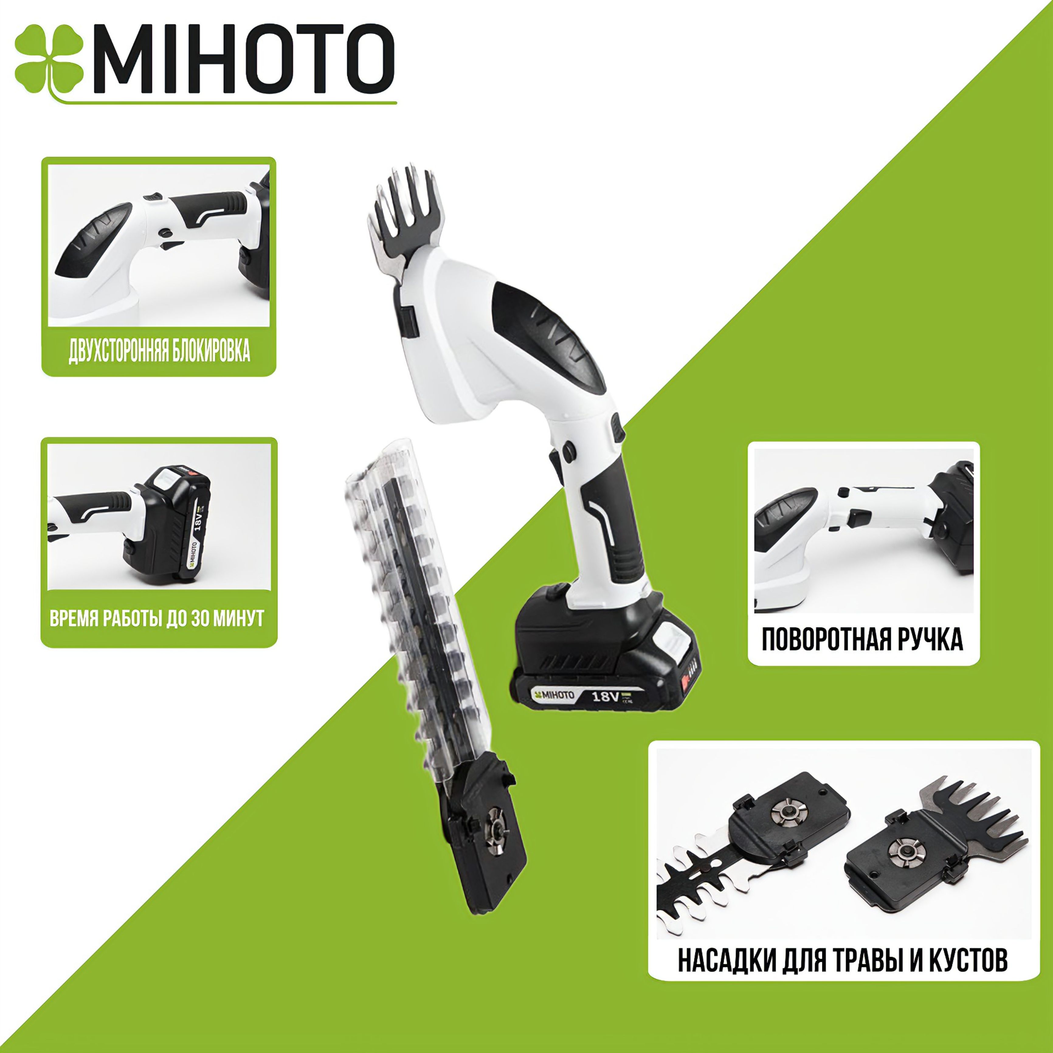 Садовые ножницы для травы и кустов на аккумуляторах Mihoto обладают надежной и прочной конструкцией. Механизм, приводящий ножницы в действие, изготовлен из закаленной стали и прослужит долгие годы. Сами ножи в насадке для стрижки травы выполнены из высококачественной стали с антикоррозийным покрытием и лазерной заточкой лезвий. Ширина ножниц для травы составляет 10 сантиметров, расстояние между лезвиями 8–19 мм. Вес инструмента с насадкой для стрижки травы и аккумулятором 1070 грамм. Поворотная рукоятка поможет повернуть лезвия даже стрижки травы в очень труднодоступных местах.