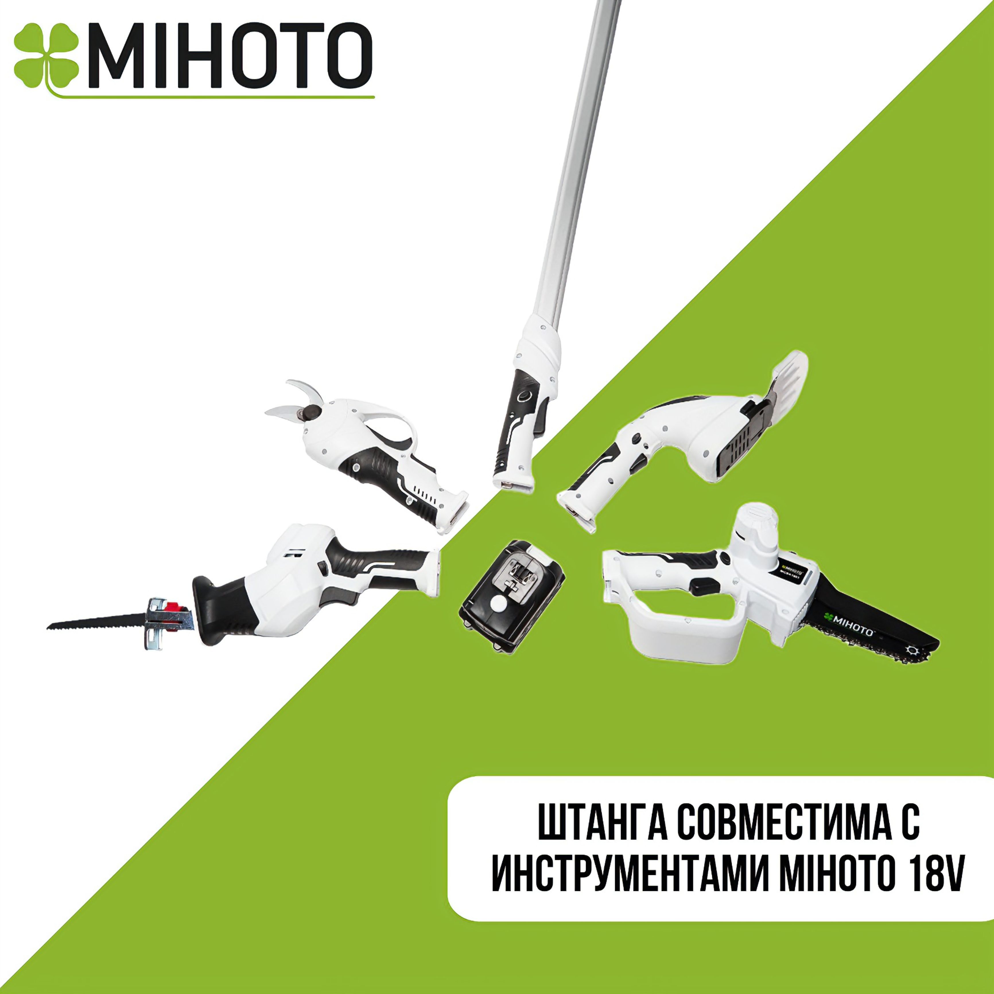 - Универсальность использования телескопической штанги, аккумуляторов и зарядки со всей линейкой инструмента Михото.