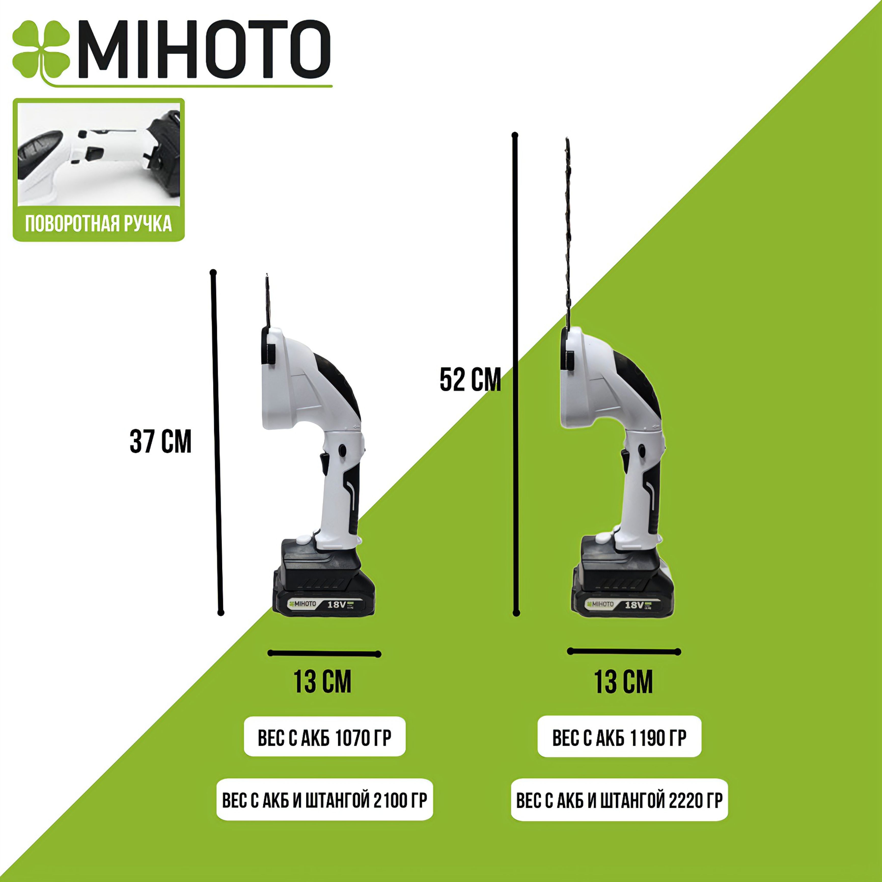 Особенностью инструмента Mihoto, можно смело назвать большую функциональность. Телескопическая штанга, выполненная из алюминия, с плавной регулировкой высоты и настройкой угла для крепления инструмента на 180 градусов, помогает выполнять любые работы на высоте до 4 метров, без стремянок и лестниц. При этом легкий вес и работа от аккумулятора, бережет ваши силы и здоровье.