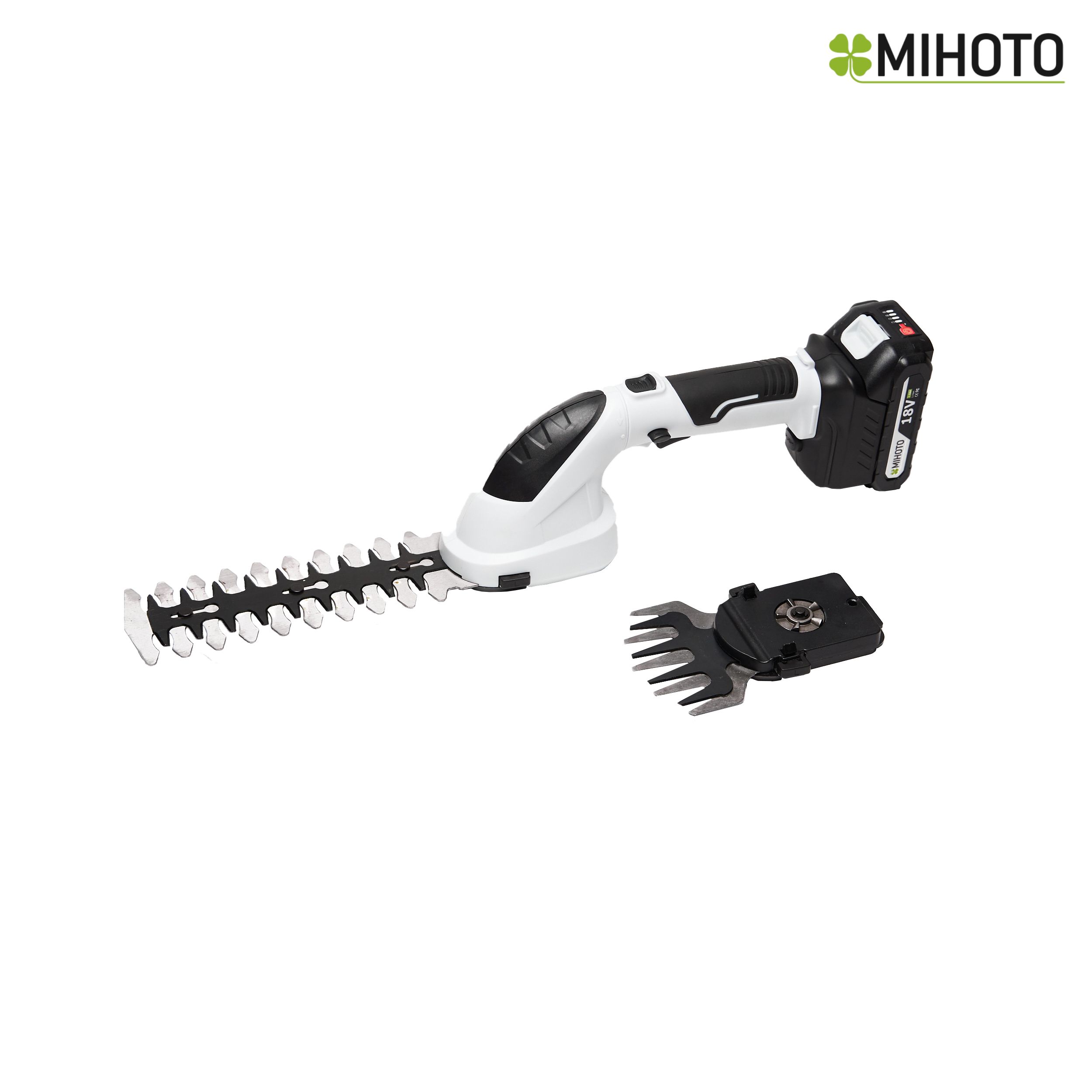 Mihoto MHSA 1801: инструмент три в одном, аккумуляторные ножницы для травы, кусторез и телескопический кусторез. Удобные, мощные и легкие садовые ножницы кусторез, позволят легко и быстро подстригать цветочные клумбы, докашивать траву в труднодоступных местах, ухаживать за цветами и стричь живую изгородь. В комплекте с ножницами идут два вида специальных, заточенных лазером лезвия, предназначенные для стрижки травы и кустарника, которые легко меняются при необходимости.
