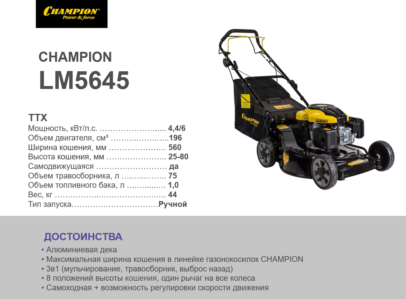 Тип газонокосилкисамоходнаяМульчированиев комплектеЗадний выбросестьТравосборникестьПроизводитель двигателяChampionМощность двигателя6 л.с.Ширина скашивания56 смКоличество колесчетырехколеснаяОбъем травосборника75 л.Объем двигателя196 куб. см.Количество тактов двигателячетырехтактныйЕмкость топливного бака1 л.Скорость вращения ножа2800 об./минСкладная ручкаестьМатериал декиалюминиевый сплавЧисло уровней высоты скашивания8Минимальная высота скашивания25 ммМаксимальная высота скашивания80 ммДиаметр передних колес20 смДиаметр задних колес20 смШирина в собранном виде58 смДлина в собранном виде167 смВысота в собранном виде100 смДвигательбензиновыйИнструмент кошенияножУровень шума98 дБВес без травосборника38.2 кгТип топливабензин АИ-92 неэтилированныйМаксимальный расход топлива2.03 л/чТип масла в двигателеSAE30Объем масла в картере двигателя0.6 лТип свечи зажиганияF7RTCВес в упаковке, кг44Габариты в упаковке, см100x62x47 -