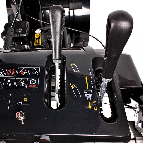 Управление углом выброса снега и управление желобом, можно производить не останавливаясь, так как рычаги управления находятся в зоне панели управления.
